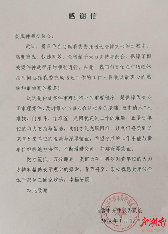 1月19日,婁底仲裁委員會收到烏魯木齊仲裁委員會發(fā)來的感謝信,信中對婁底仲裁委員會為協助烏魯木齊仲裁委員會送達法律文書所做的工作表示感謝。