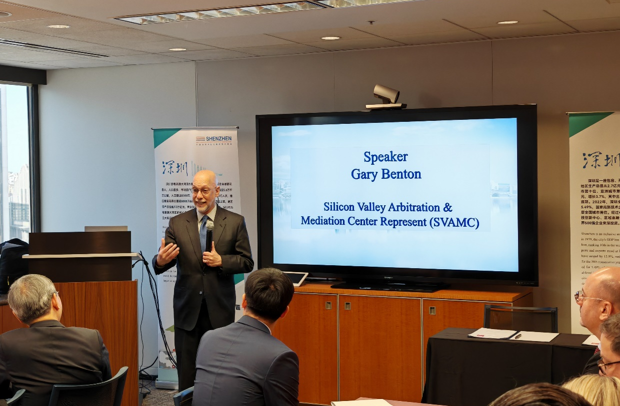 深國仲院長劉曉春在歡迎辭中分享了國際仲裁在中國深圳經(jīng)濟特區(qū)的最新發(fā)展和規(guī)則創(chuàng)新。中國駐舊金山總領(lǐng)事館商務(wù)參贊鄔沛民到場祝賀,他表示以深國仲為代表的高水平國際商事仲裁將為中美兩國經(jīng)貿(mào)交往提供更為穩(wěn)定的預(yù)期。深圳市駐北美經(jīng)貿(mào)代表處首席代表于智榮介紹深圳的最新發(fā)展與投資機遇。硅谷國際仲裁調(diào)解中心主席加里·本頓致辭,表示希望與深國仲加強合作,共同促進舊金山灣區(qū)與粵港澳大灣區(qū)的企業(yè)交流。美國司法仲裁與調(diào)解機構(gòu)總裁克里斯·普爾回顧了與深國仲的多年合作歷史,并期待進一步的合作。深國仲國際合作與發(fā)展處處長兼深國仲江門中心主任黃郭勇主持活動。