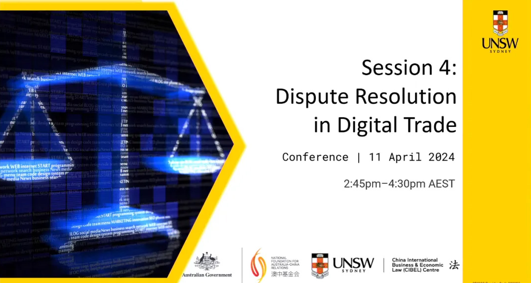 2024年4月11日,由新南威爾士大學(xué)中國國際商法與經(jīng)濟(jì)法中心(CIBEL)和澳中基金會(huì)(NFACR)聯(lián)合主辦的主題為“數(shù)字時(shí)代的澳中商業(yè):在激流中航行”的國際研討會(huì)以線上線下相結(jié)合方式舉辦。本次研討會(huì)匯集了來自中澳兩國法律和商業(yè)領(lǐng)域的專家,共同圍繞數(shù)字貿(mào)易的監(jiān)管、數(shù)字金融的影響以及相關(guān)爭(zhēng)議的解決等內(nèi)容展開交流和討論。中國國際經(jīng)濟(jì)貿(mào)易仲裁委員會(huì)(以下簡(jiǎn)稱“貿(mào)仲”)事業(yè)發(fā)展處處長(zhǎng)陸菲女士受邀在第四議題中代表貿(mào)仲發(fā)言。