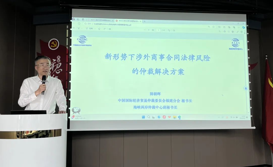 活動中,海峽兩岸仲裁中心副秘書長、中國國際經(jīng)濟(jì)貿(mào)易仲裁委員會福建分會秘書長陳朝暉以“新形勢下涉外商事合同法律風(fēng)險的仲裁解決方案”為題,結(jié)合大量實務(wù)案例,幫助企業(yè)了解國際商事合同常見法律風(fēng)險點(diǎn),并指導(dǎo)企業(yè)靈活運(yùn)用國際商事仲裁這一涉外商事爭議的有效解決方式。
