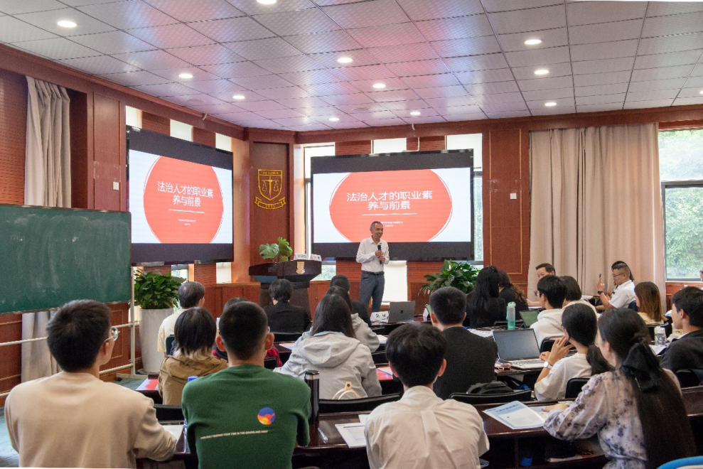 原美的集團全球法務(wù)總監(jiān)、貿(mào)仲仲裁員陳敏作專題演講。陳敏談到,法治人才的職業(yè)素養(yǎng)并不是一種知識,而是一種訓練,法學院的學生應(yīng)當具備的職業(yè)素養(yǎng)包括樹立證據(jù)意識、做事留痕、具備批判思維和審慎品質(zhì)等。法治人才的難得在于不但需要有扎實的法律知識,還需要具備更多其他行業(yè)的基礎(chǔ)知識,必須有意識地突破自己的職業(yè)局限,多方面培養(yǎng)自己的知識體系。他還以網(wǎng)絡(luò)熱詞為例,談?wù)摿四壳暗纳鐣蜆I(yè)情況及學子們進入職場后可能會遇到的問題,并給出了解決方式和建議。最后,他以“主動權(quán),決定生存權(quán)”作為結(jié)束語,呼吁學子們厚積薄發(fā),主動把握未來。