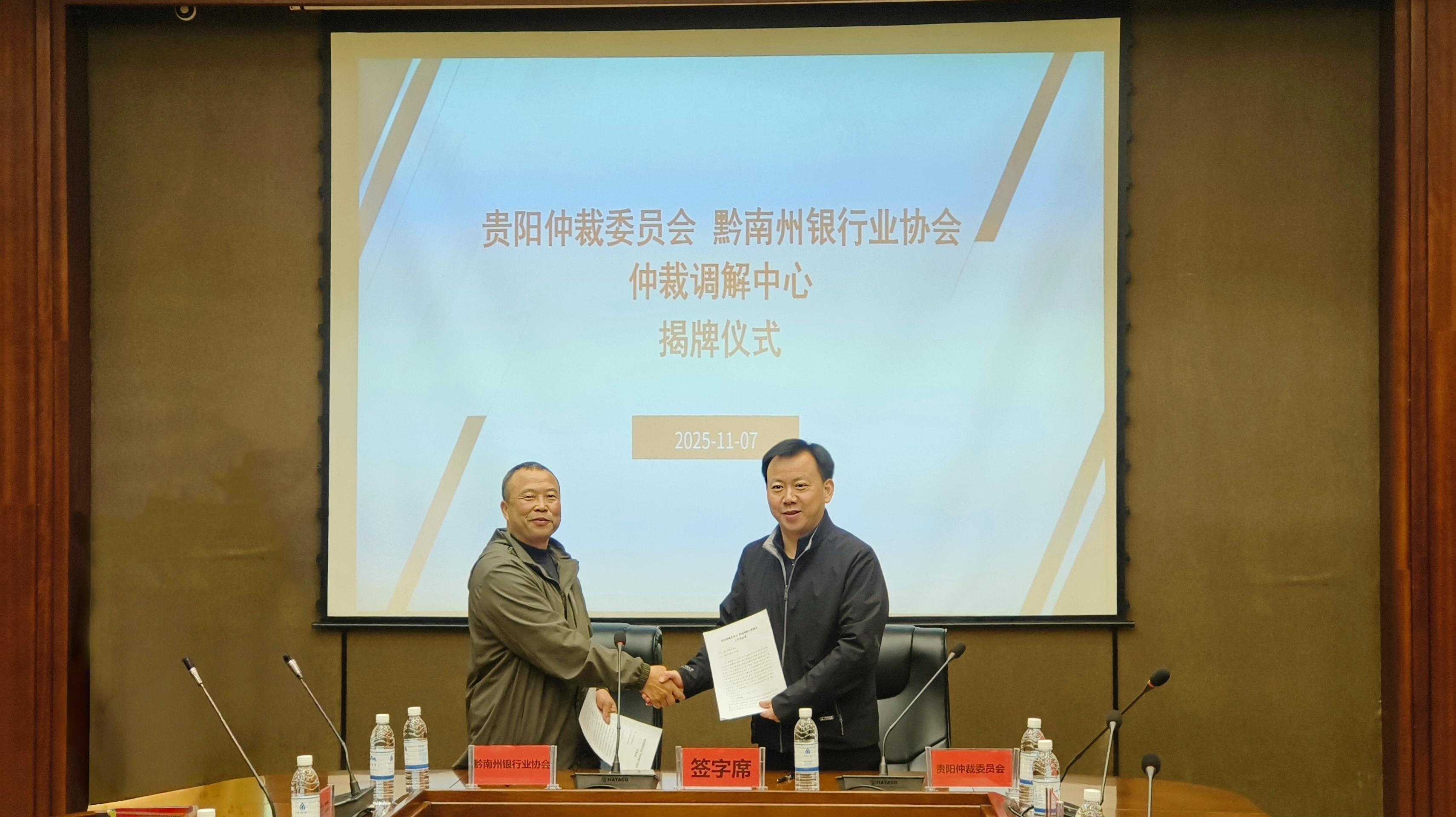 為健全黔南州金融糾紛多元化解機(jī)制,提升金融領(lǐng)域矛盾糾紛化解質(zhì)效,11月7日,“貴陽仲裁委員會(huì)黔南州銀行業(yè)協(xié)會(huì)仲裁調(diào)解中心”揭牌儀式順利舉行。貴陽仲裁委員會(huì)主任卜貴榮、黔南州金融監(jiān)管分局副局長劉廷志共同為仲裁調(diào)解中心揭牌,貴陽仲裁委員會(huì)副主任王常毅與黔南州銀行業(yè)協(xié)會(huì)秘書長陳傳勛簽署工作備忘錄。