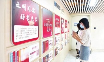 在位于黃浦路地鐵站的全市首個“武漢文明空間”,乘客可以閱讀好書。圖為乘客在武漢地鐵有聲圖書館掃碼找書。長江日報記者許魏巍 攝