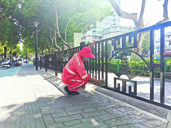蕪湖路上,環(huán)衛(wèi)工人正在擦拭護(hù)欄。