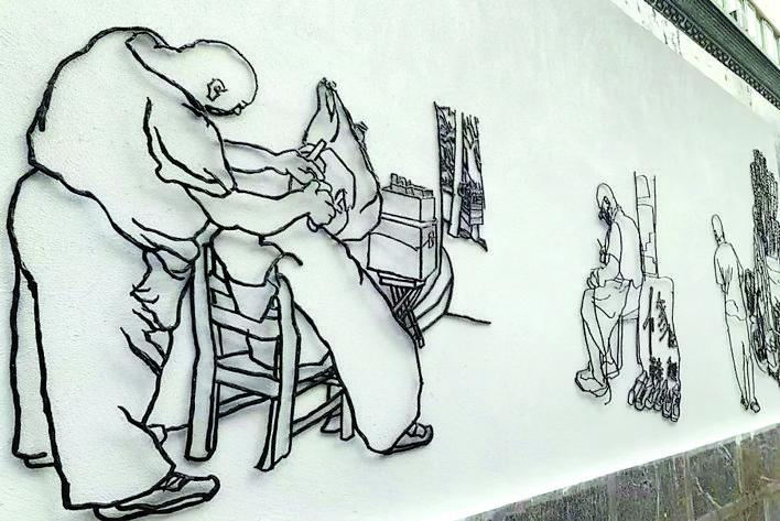 除了手繪壁畫,在北油坊巷東段入口處還有一面鐵畫墻。精湛的民間鐵畫技藝還原了市井百態(tài),城市民生最拙樸的風貌得以展現(xiàn),讓老巷多了些煙火逍遙。