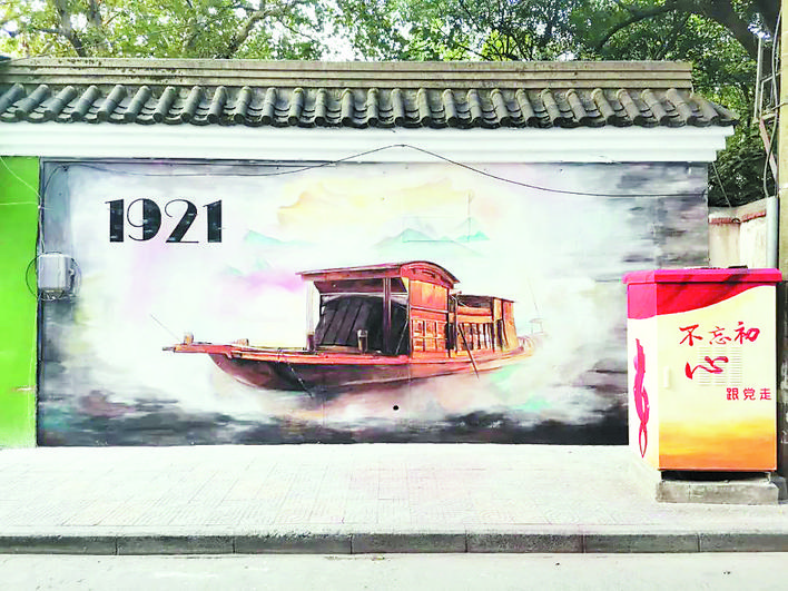 有一面墻上畫著1921年嘉興南湖上的“小舟”。那是孕育中國共產(chǎn)黨的地方,奔涌的水面上“紅船”穩(wěn)穩(wěn)航行,讓人感受到黨的堅定與力量。