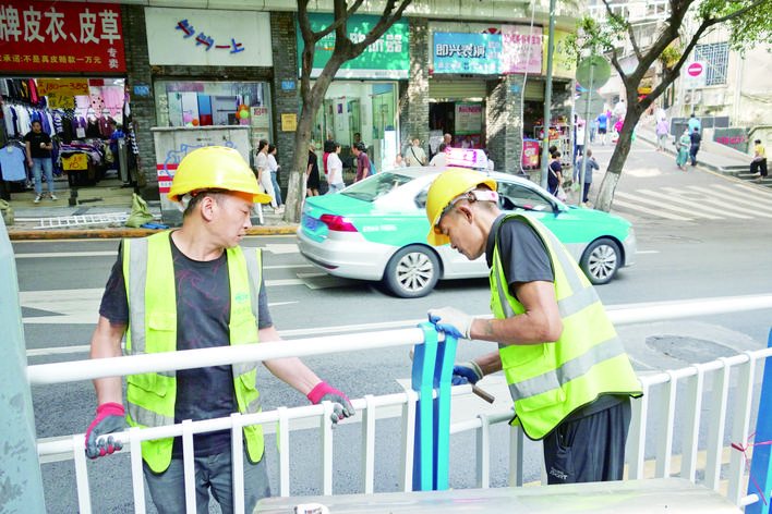 新城路,工人安裝人行道護(hù)欄。