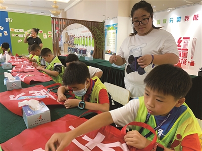 在下午的活動(dòng)中,小記者們來到城管義工展廳,學(xué)習(xí)用廢棄的橫幅手工縫制環(huán)保袋,積極響應(yīng)“低碳生活”的號(hào)召。許多小朋友都是第一次做針線活,但看到自己制作完成的環(huán)保袋后,充滿了成就感。