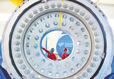 在七里河流經(jīng)的邢臺經(jīng)濟(jì)開發(fā)區(qū),金風(fēng)科技有限公司邢臺風(fēng)機(jī)總裝生產(chǎn)基地內(nèi),員工在檢查風(fēng)力發(fā)電機(jī)組軸系。