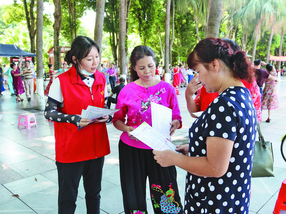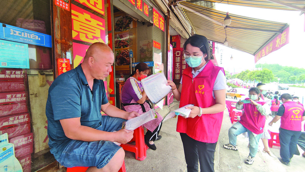 志愿者向居民宣傳創(chuàng)建文明城市相關(guān)知識(shí)。