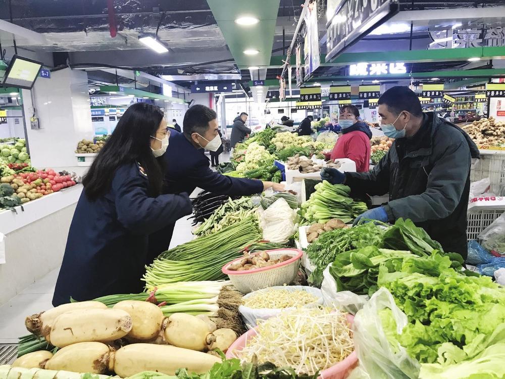 市場(chǎng)監(jiān)管執(zhí)法人員檢查集貿(mào)市場(chǎng)秩序。