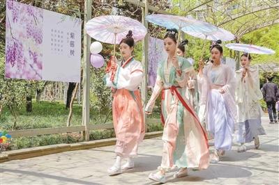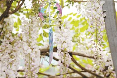 從拱門花架下穿行入園,一簇一簇淡紫色花串從棚架傾瀉而下,隨春風(fēng)飄蕩,與風(fēng)鈴發(fā)出的陣陣清脆相和;一群身著漢服的國風(fēng)女孩穿梭其間,演繹公園最靚麗的風(fēng)景線?!澳憧?,原來這些紫藤花有不同的名字,李白、白居易這些大詩人都為紫藤寫過詩?!奔易」珗@對面名城燕園小區(qū)的張銳帶著五歲的女兒來賞花,邊看還邊為女兒講解。
