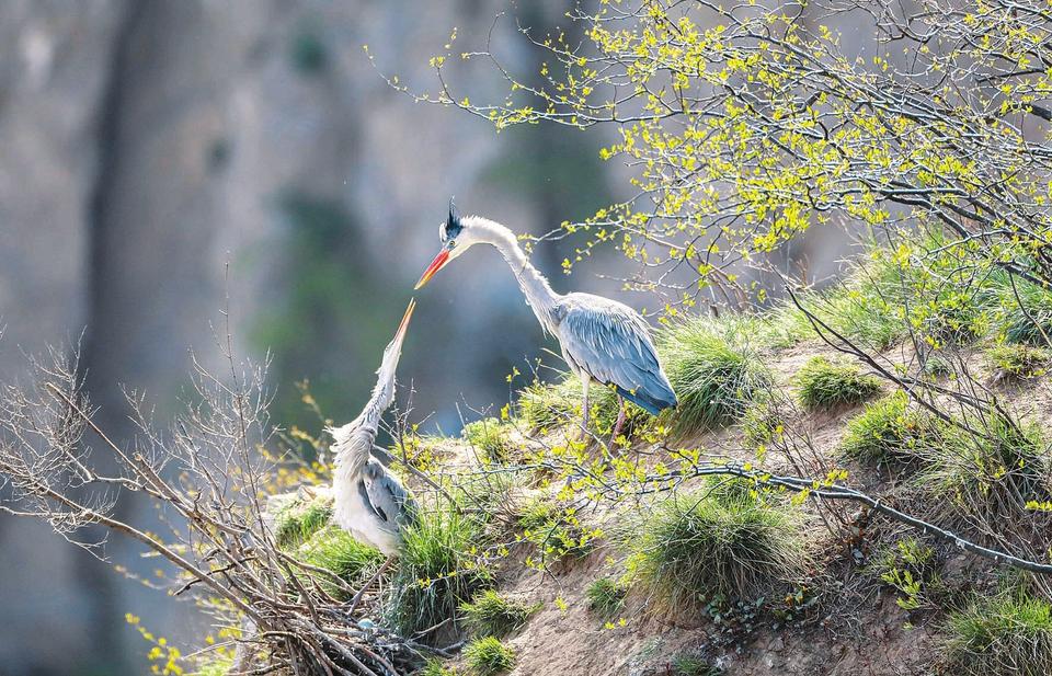 4月6日,平陸縣好漢坡黃河岸邊的懸崖峭壁上,蒼鷺在此處棲息、繁衍。近年來,運城市圍繞黃河流域生態(tài)保護和高質(zhì)量發(fā)展,多措并舉實施水土保持工程和入黃水污染治理,極大地改善提升了當(dāng)?shù)攸S河沿線生態(tài)環(huán)境,吸引了眾多野生鳥類來此棲息繁衍,生物多樣性不斷豐富。(金玉敏)