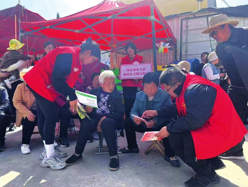 寶雞市鳳縣留鳳關(guān)鎮(zhèn)三岔村近日舉辦了“三月三”物資交流會,鎮(zhèn)上針對會期群眾相對集中、人流量大、信息傳遞密集的特點,組織鎮(zhèn)市場監(jiān)管所、派出所、財政所、司法所等單位,開展系列政策宣傳活動,免費發(fā)放惠民惠農(nóng)一卡通,乘車安全、養(yǎng)老保險宣傳資料和生活用品,并為群眾測血糖、量血壓等,在秦腔演出過程中還穿插宣傳黨建相關(guān)知識,把黨的創(chuàng)新理論送到人民群眾心坎上,使農(nóng)貿(mào)集市充滿了時代氣息,變成一個“文明集市”。(記者 馬慶昆 攝)