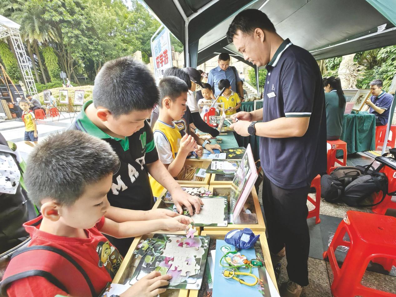 9月9日,2023年廣西野生動(dòng)植物保護(hù)宣傳月主題宣傳暨南寧市野生動(dòng)植物保護(hù)宣傳月在南寧市青秀山風(fēng)景區(qū)啟動(dòng)。圖為小朋友們?cè)谧匀患袇⒓踊?dòng)小游戲。 記者 葉子榕 攝