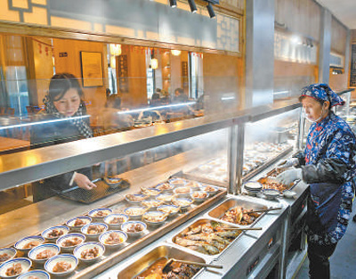 2月23日,安徽省銅陵市義安區(qū)鐘鳴鎮(zhèn)永泉農(nóng)莊自助餐廳為顧客提供了小份菜。過仕寧 攝(人民視覺)