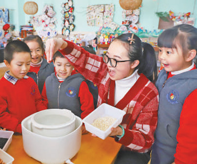 近日,浙江省臺(tái)州市路橋區(qū)中心幼兒園的老師帶小朋友認(rèn)識(shí)糧食,培養(yǎng)愛糧節(jié)糧的意識(shí)。蔣友青 蔣歆慧 攝(人民視覺)