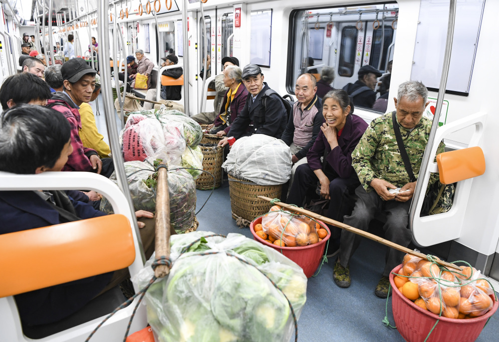 圖為菜農(nóng)乘坐重慶軌道交通4號線,前往城區(qū)的菜市場售賣農(nóng)產(chǎn)品。(記者 王全超 攝)