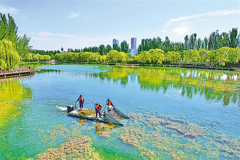 5月8日,銀川市河道管理所的工作人員清撈典農(nóng)河河道內(nèi)的水草。隨著氣溫升高,典農(nóng)河中的水草進(jìn)入生長繁殖高發(fā)期,大面積生長的水草不僅會(huì)影響河道景觀,腐爛的水草還會(huì)對(duì)水域造成污染、滋生蚊蠅,影響水域生態(tài)環(huán)境。針對(duì)不同水域水草生長態(tài)勢(shì),銀川市水務(wù)部門按照“科學(xué)管控、生態(tài)治理”的原則提前安排,分河段、分時(shí)間對(duì)過量生長的水草實(shí)施修剪、打撈清理,讓河水保持清澈,為市民創(chuàng)造良好的宜居環(huán)境。(記者馬楠 王洋 攝)