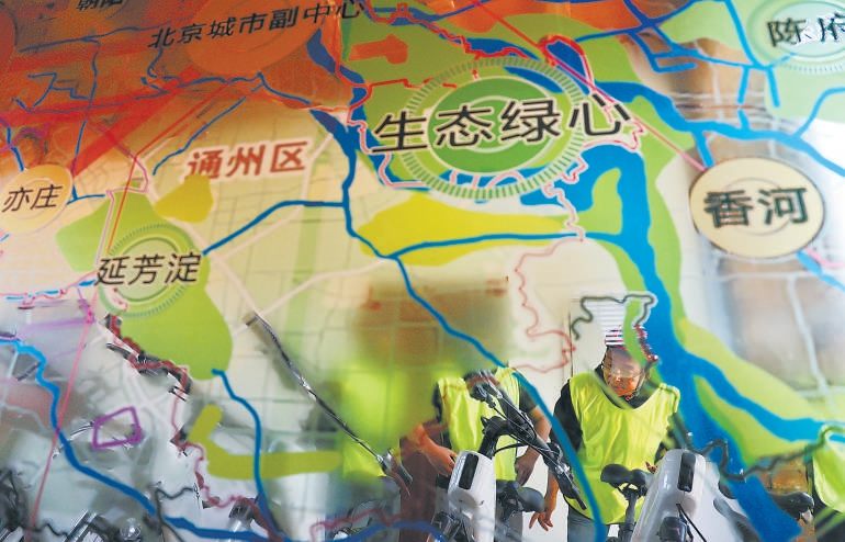 騎行驛站內(nèi)的玻璃幕墻上有一幅巨大地圖,展示著城市副中心與大運河景區(qū)的發(fā)展變化。