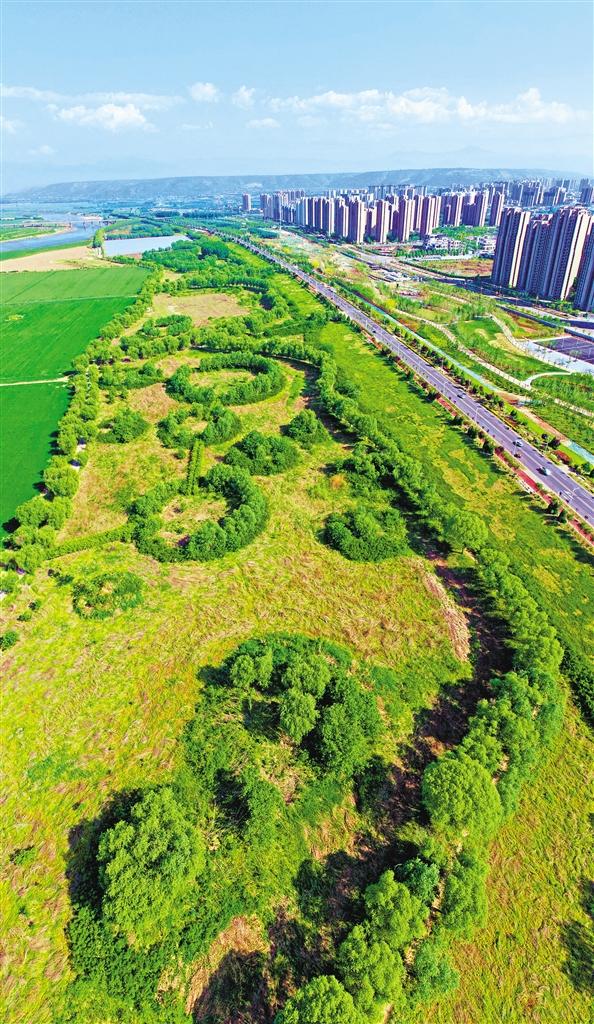 5月6日,無人機拍攝的渭南市渭河生態(tài)公園綠意盎然。 記者 杜瑋 攝