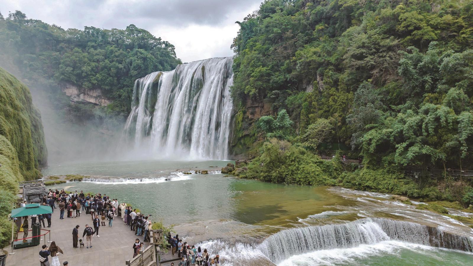 10月7日,游客在貴州省安順市黃果樹瀑布景區(qū)游覽(無(wú)人機(jī)照片)。
