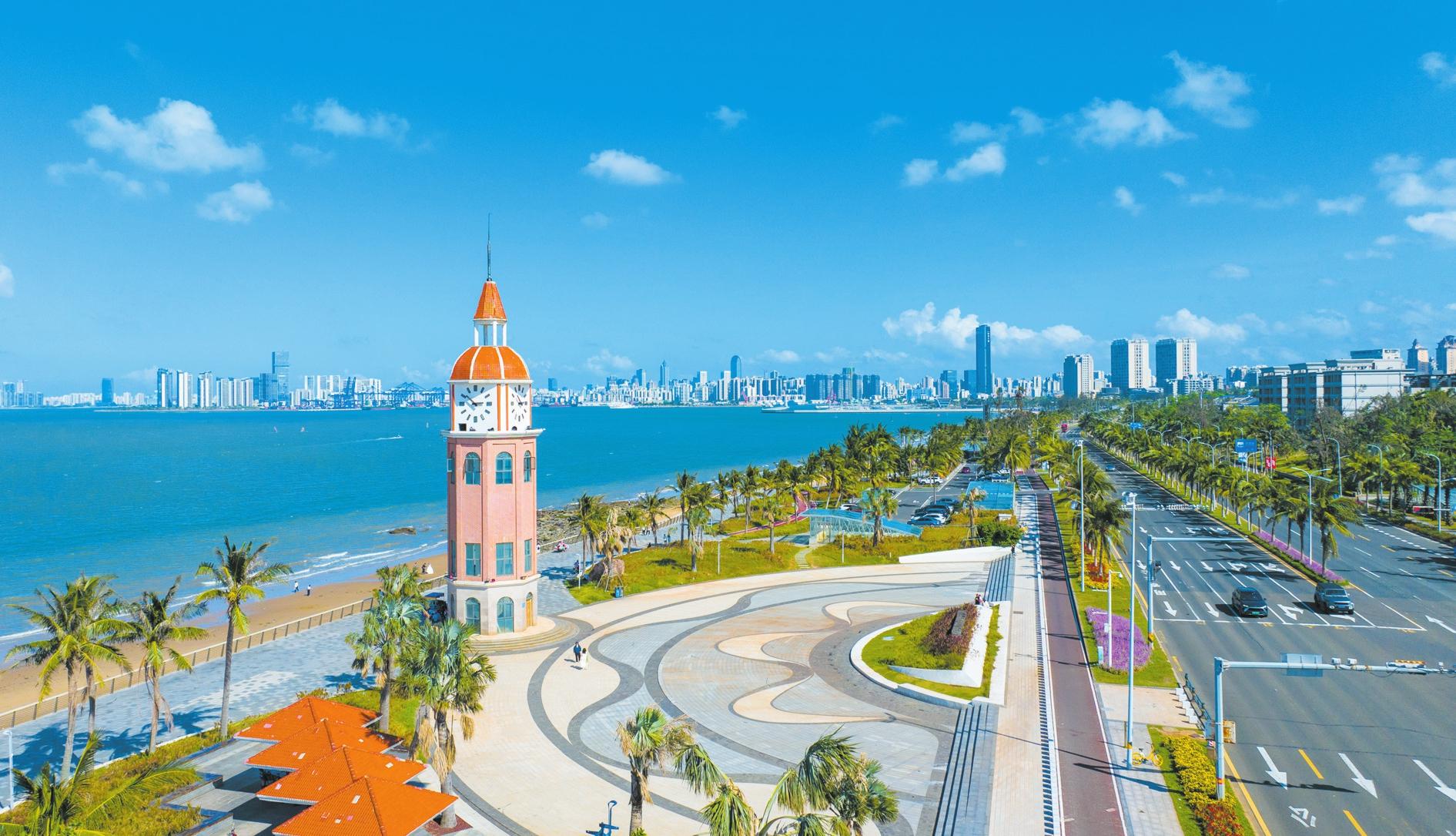 圖為10月20日,遠(yuǎn)眺濱海大道,水天相接,岸邊的沙灘、鐘樓、椰林融為一體,相映成趣,椰城??诘臑I海美景一覽無遺。記者 楊忠凱 攝