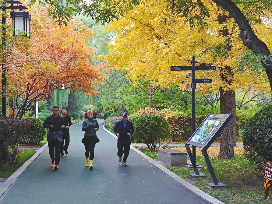 11月3日,太原市迎澤公園內(nèi),金黃的秋葉給微涼的清晨增添一抹亮色,市民們早起跑步,在公園內(nèi)呼吸著雨后的清新空氣,享受城市生態(tài)之美。申晉光 攝