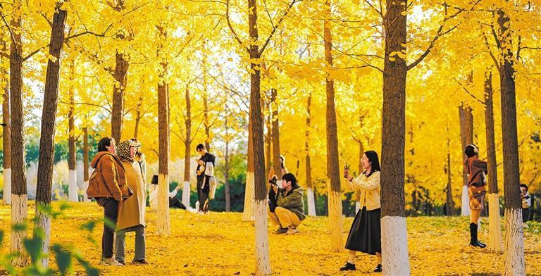 11月3日,市民游客在北京奧林匹克森林公園銀杏林樂享秋日美好時光。