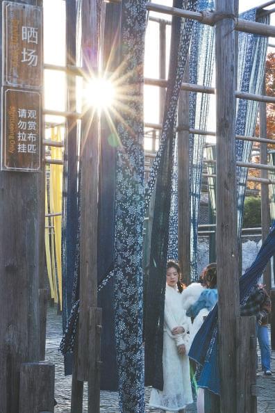 一匹匹高掛的藍(lán)印花布飛瀉而下,冬日暖陽中讓游客感受古鎮(zhèn)的溫暖。