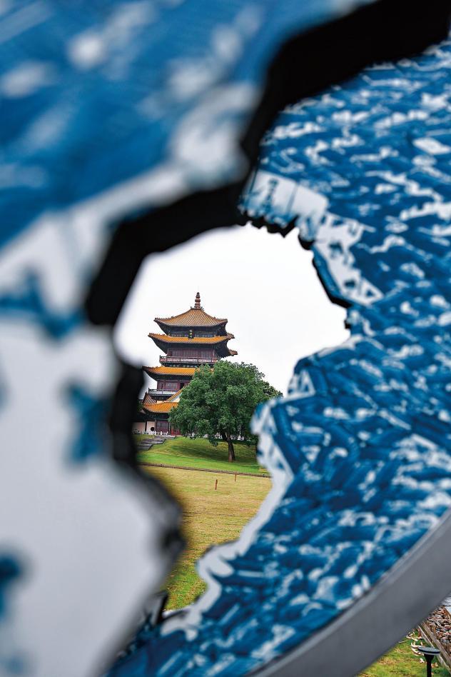 6月5日,在江西景德鎮(zhèn)透過創(chuàng)意青花瓷盤拍攝的龍珠閣。記者 劉力航攝