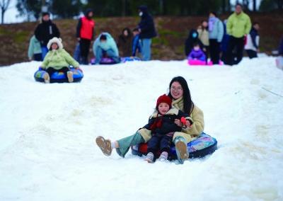 市民游客在浦口區(qū)水墨大埝的金陵冰雪大世界體驗(yàn)冰雪游樂項(xiàng)目,享受冰雪樂趣。