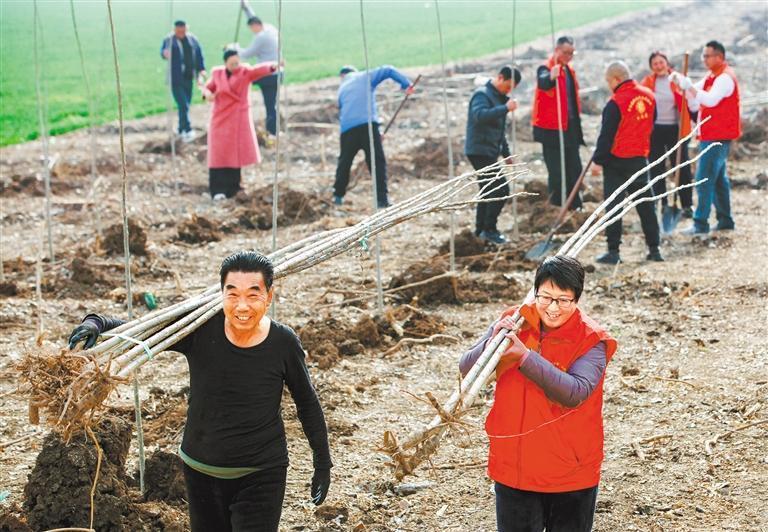 3月11日,河南省焦作市博愛縣許良鎮(zhèn)泗溝村,村民在搬運樹苗。程全 攝(中經(jīng)視覺)