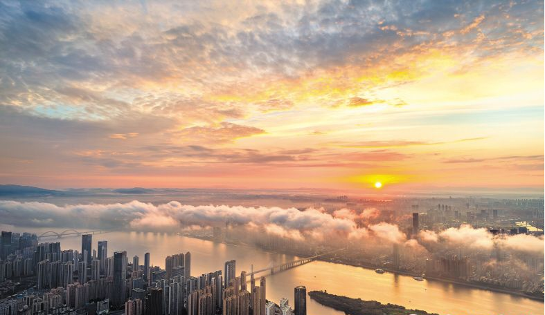經(jīng)過23日的降水后,7月24日清晨,長沙在云霧繚繞中迎來絕美日出。高空俯瞰,湘江如絲帶穿城而過,一江兩岸,鱗次櫛比的建筑群在云海中“現(xiàn)身”。初升的太陽灑下暖金光芒,江水、山巒與橋梁、城市輪廓交融,構(gòu)成現(xiàn)實(shí)版“天空之城”,美不勝收。記者 郭雨滴 攝