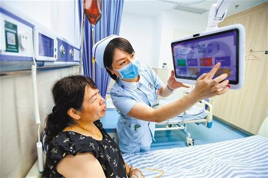 7月22日,江西省宜春市人民醫(yī)院護士在智慧病房向患者講解床頭交互系統(tǒng)的使用方法。當?shù)卮罅ν七M智慧醫(yī)院建設(shè),搭建互聯(lián)網(wǎng)醫(yī)院、遠程醫(yī)療、智慧病房等平臺,提升醫(yī)療質(zhì)量與工作效率。周亮 攝(中經(jīng)視覺)
