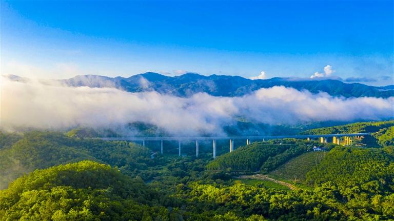 驅(qū)車行駛在瓊樂高速路上,宛如置身百里畫廊,路兩旁層巒疊翠,云霧與遠(yuǎn)山相守相望,路、橋、隧道與樹林、田野、江水、湖泊等沿途景致和諧相融,渾然一體,堪稱“海南最美高速公路”。