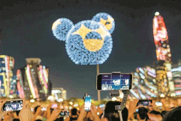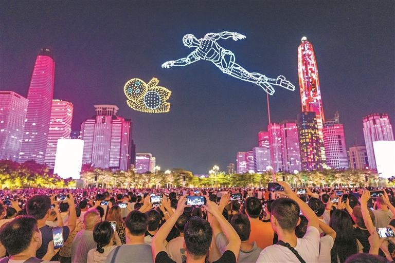 當(dāng)無人機(jī)陣列掠過夜空,地面建筑群也將隨之脈動。流光從云端灑向樓宇,色彩如呼吸般明滅變幻,天地連成一體。霓虹勾勒出特區(qū)發(fā)展長卷,光影流轉(zhuǎn)中浮現(xiàn)特區(qū)精神的時(shí)代符號——這是一座城市向自己的生日深情致敬。