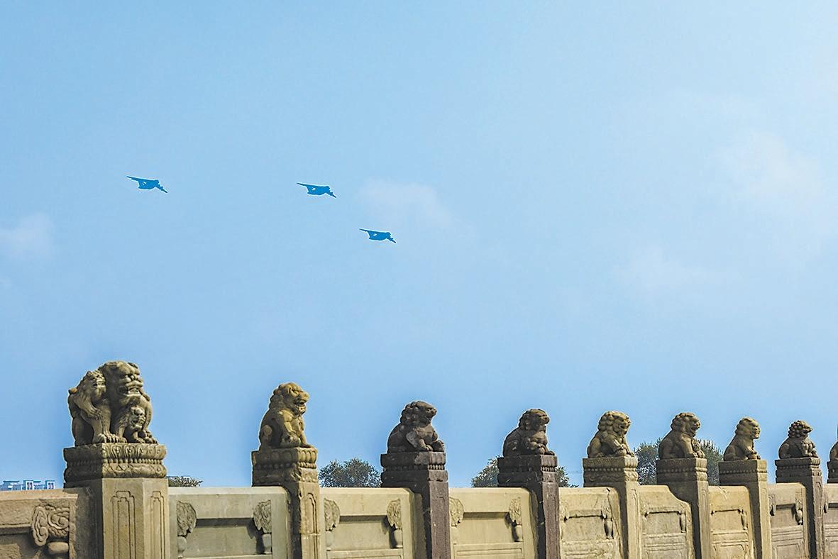 空中編隊飛越盧溝橋,向抗戰(zhàn)英魂致敬。金春花 攝