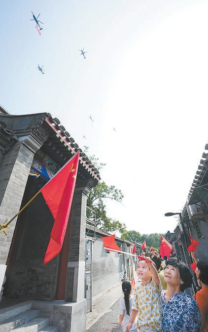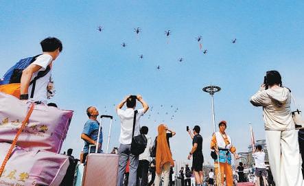 北京站前廣場旅客駐足觀看直升機梯隊。記者 安旭東 攝