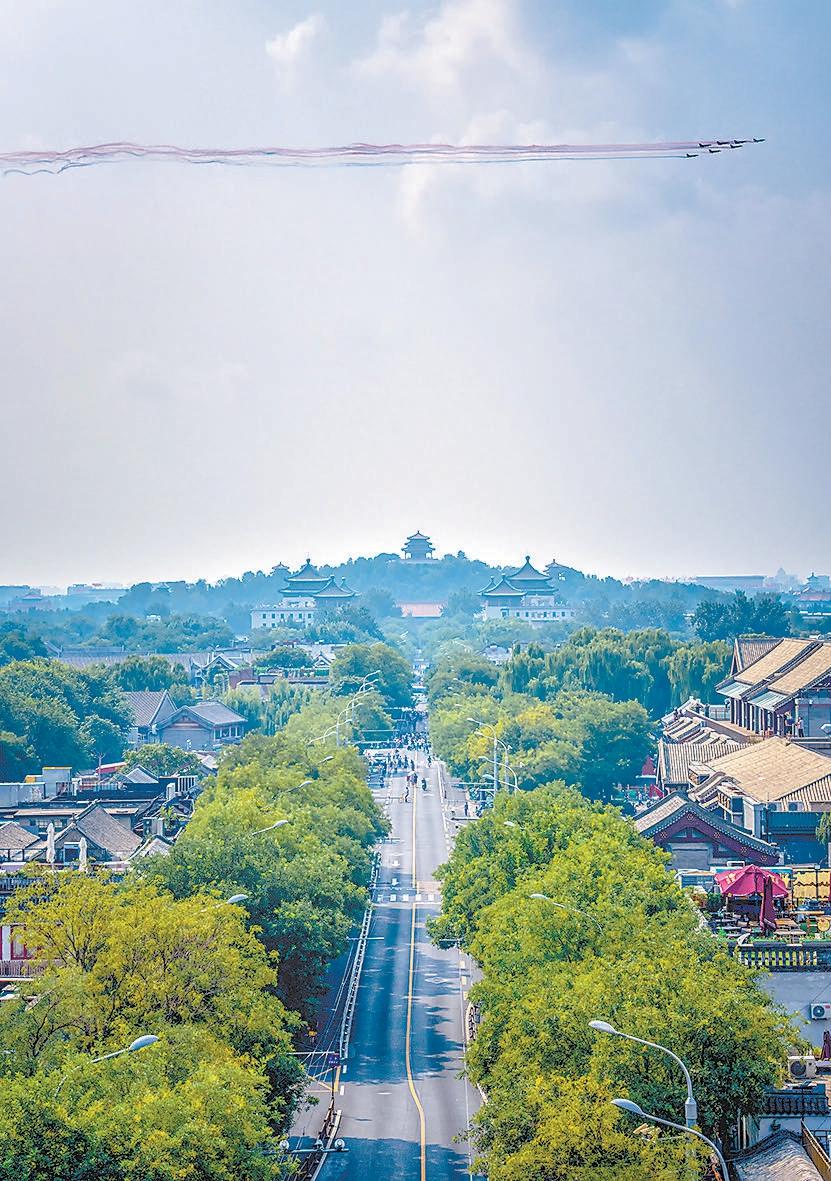 戰(zhàn)機編隊拉出的彩煙與中軸線上的古都風貌交相輝映。趙瑞 攝