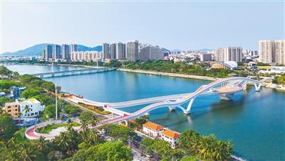 航拍陵水知音橋。該橋橫跨陵水河,有著獨特的雙層結(jié)構(gòu)與鮮明的外觀,是一座智慧互動型人行景觀橋。記者 王程龍 攝