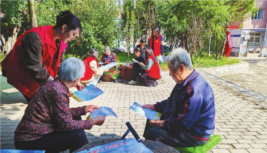 喀左縣志愿者向居民宣傳城市文明建設(shè)常識。 李娜 攝