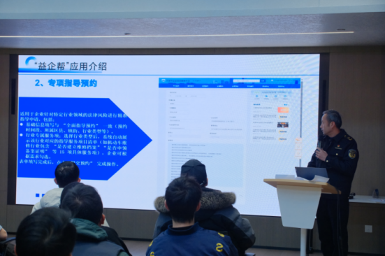 圖為執(zhí)法骨干在花園里座談會給商圈店長介紹“益企幫”應(yīng)用