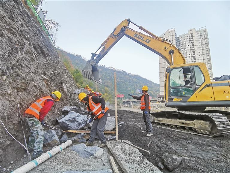 1月12日,在白河縣城區(qū)向榮—獅子山道路建設(shè)項目現(xiàn)場,工人在進(jìn)行路段肩墻砌筑工程施工。通訊員 鄒益山攝
