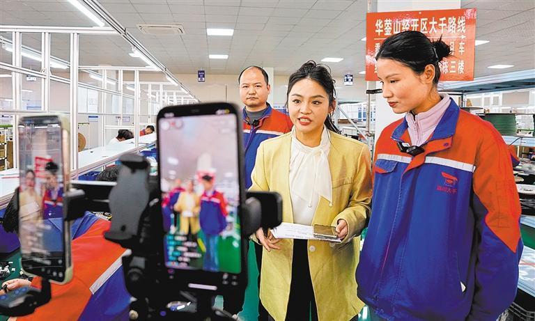 2月26日,四川省華鎣市組織網絡主播走進企業(yè)生產車間,通過直播平臺向網絡求職者介紹企業(yè)情況。當地搭建企業(yè)和求職者崗位對接平臺,實現“崗位找人”與“人找崗位”雙向互動。周松林攝(中經視覺)