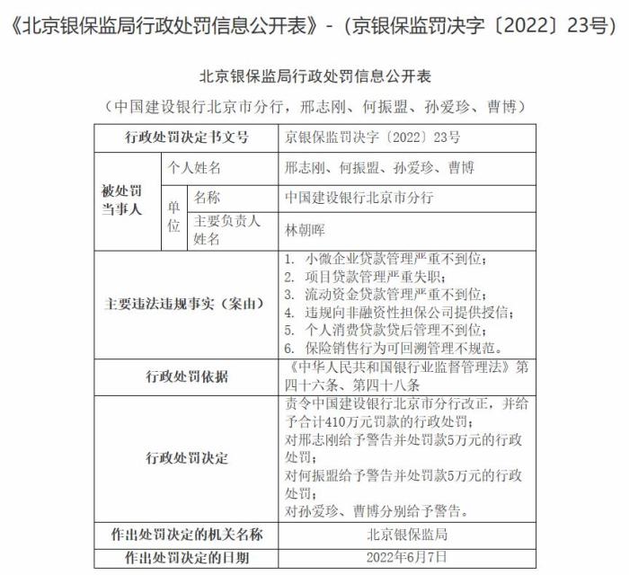 近日,中國(guó)銀行保險(xiǎn)監(jiān)督管理委員會(huì)網(wǎng)站顯示,中國(guó)建設(shè)銀行北京分行因小微企業(yè)貸款管理嚴(yán)重不到位、項(xiàng)目貸款管理嚴(yán)重失職、流動(dòng)資金貸款管理嚴(yán)重不到位、違規(guī)向非融資性擔(dān)保公司提供授信、個(gè)人消費(fèi)貸款貸后管理不到位、保險(xiǎn)銷售行為可回溯管理不規(guī)范等,被北京銀保監(jiān)局責(zé)令改正,并罰款410萬(wàn)元,給予邢志剛警告并處罰款5萬(wàn)元、給予何振盟警告并處罰款5萬(wàn)元的行政處罰,并對(duì)孫愛(ài)珍、曹博給予?警告。