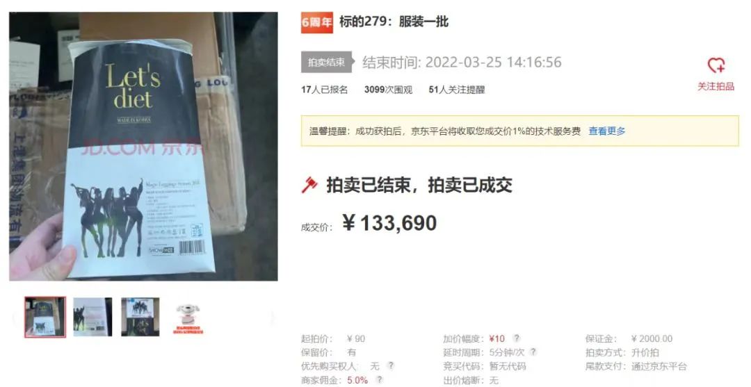 據(jù)統(tǒng)計,本次拍賣專場共有1.5萬名用戶設(shè)置了關(guān)注提醒,總圍觀次數(shù)超過了44萬次,參拍用戶共3034名,累計競價次數(shù)3萬多次。其中“標的279:服裝一批”起拍價90元,貨量超9000件,最終成交價13.37萬元,溢價率高達148倍,為本次拍賣會溢價率最高的標的?!皹说?86:油畫一批”包括18幅創(chuàng)作精美的畫作,競價次數(shù)達到了761次,成了本場拍賣會“最受買家青睞”的拍品。