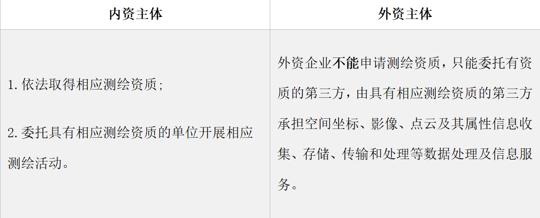 根據(jù)上述規(guī)定,涉及到測(cè)繪活動(dòng)的相關(guān)主體,內(nèi)外資在進(jìn)行測(cè)繪地理信息數(shù)據(jù)的處理活動(dòng)中,《通知》對(duì)其合規(guī)性的要求皆然不同,主要體現(xiàn)如下: