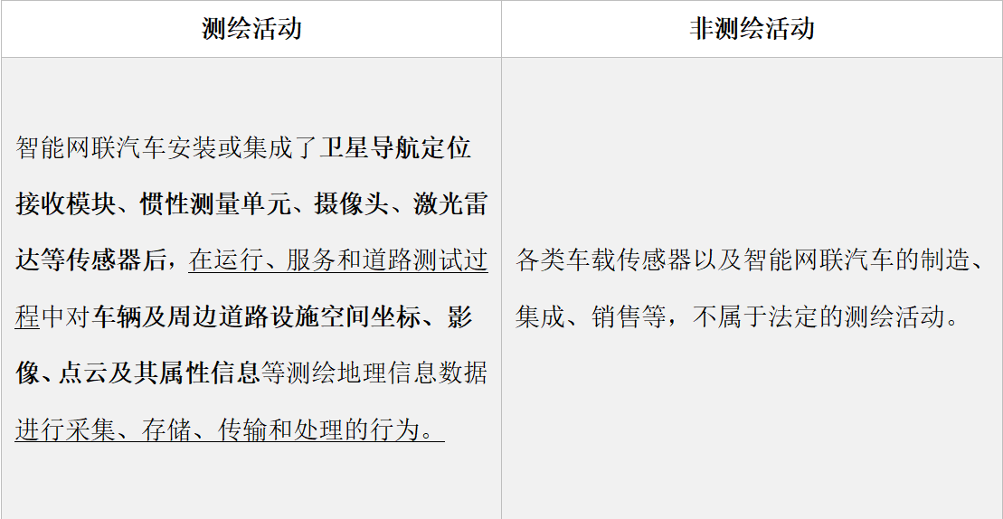 答:《通知》采用列舉的方式,明確了測(cè)繪活動(dòng)及非測(cè)繪活動(dòng)的含義,簡(jiǎn)而言之:測(cè)繪活動(dòng)是通過車載傳感器設(shè)備,在運(yùn)行服務(wù)中,對(duì)車輛及周邊坐標(biāo)、影像、點(diǎn)云及屬性信息的相關(guān)處理活動(dòng)。而制造、銷售、集成等不涉及信息采集的活動(dòng)則不屬于測(cè)繪活動(dòng)。