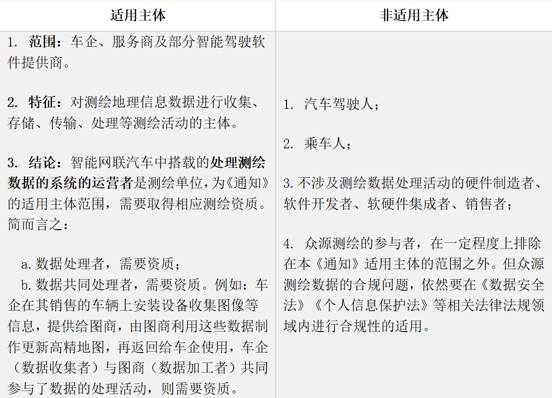 按照目前的市場(chǎng)情況來看,《通知》規(guī)范的主體主要為車企、服務(wù)商及部分智能駕駛軟件提供商,而對(duì)于僅獲得輔助駕駛等服務(wù)的智能網(wǎng)聯(lián)汽車駕乘人員,則不屬于有關(guān)測(cè)繪活動(dòng)的行為人。